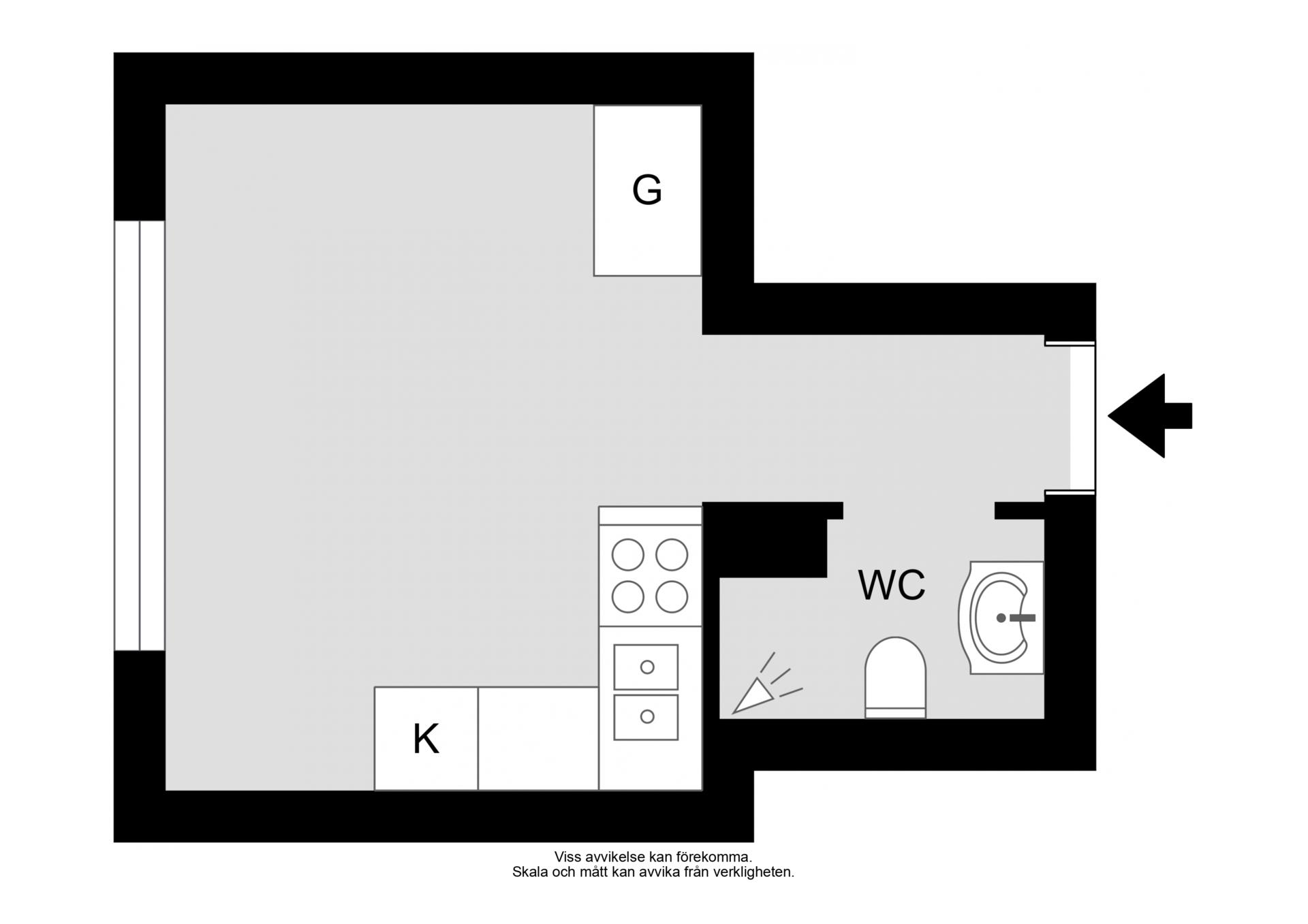 Planlösningen är genomtänkt och flexibel med plats för säng, matbord och skrivbord. Förvaringen är utmärkt med tre garderober samt två tillhörande förråd.